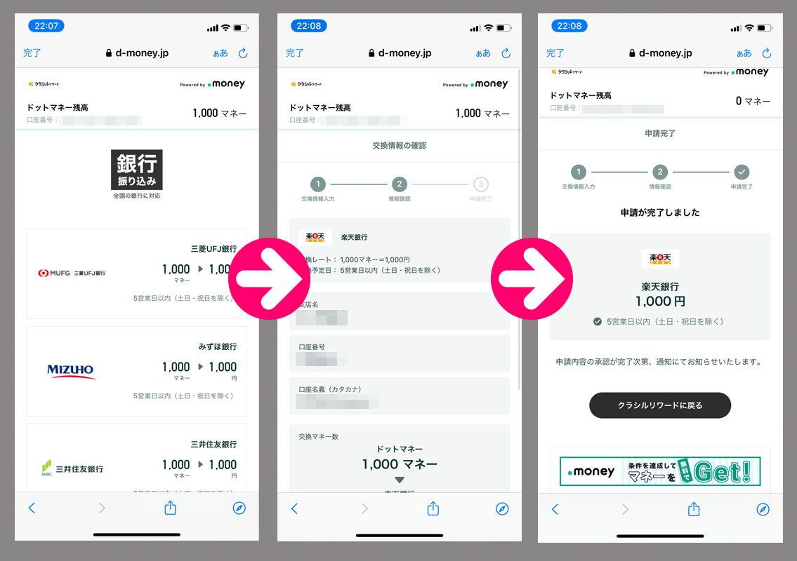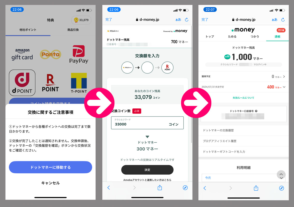 歩いてポイントを稼ぐアプリ「クラシルリワード」のコインが33,000になったのでドットマネーに交換します。これでドットマネーが1,000マネーになるので続いて換金の手続きをしました。