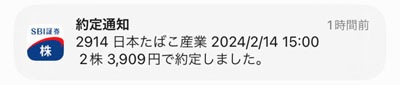 昼休みの注文でしたので今日の午後引けでの約定なのでイコール終値となります。