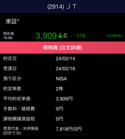 JTはNISAの成長投資枠で買うのは初めてなので今後これより下がればいいのですが・・・まぁまだ僅か2株なので先は長い。。。