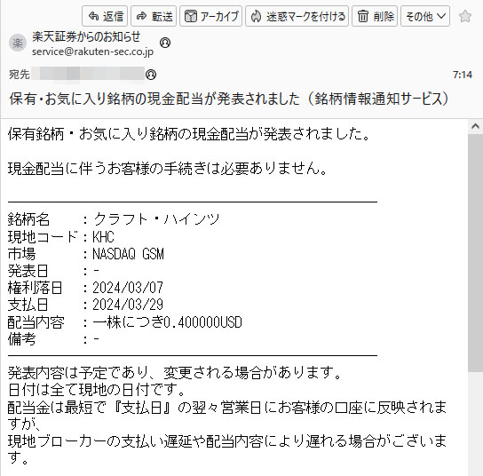 年明けから投資を始めた「クラフト・ハインツ」の配当のお知らせが楽天証券からメールで来ました。保有してから初めての配当です!こちらまだ2株しかもっていません。。。