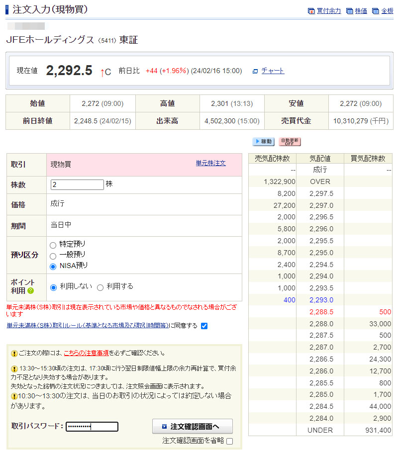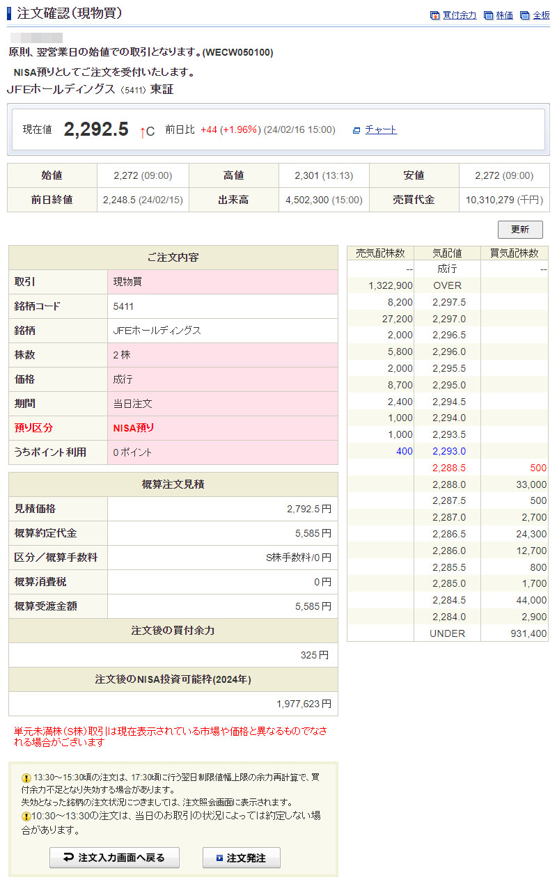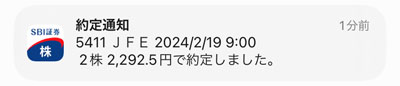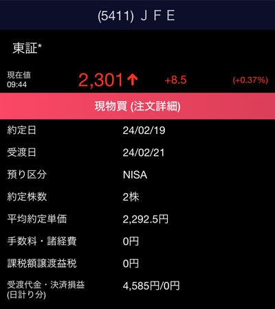 クレディセゾンの買い注文を入れるついでに「JFEホールディングス」も2株買い注文を入れました。