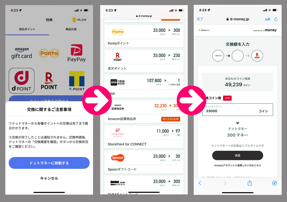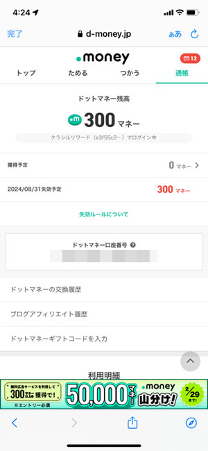 クラシルリワードのコインが貯まったのでドットマネーに変換|2024.2.23 レシチャレのコインが20,000入り33,000コインを超えたのでドットマネーに変換します。 (交換方法についてはこちらをご覧ください) 今回も楽天ポイントを選び途中で止めてドットマネーにプールして置きます。前回換金したので口座は0ドットマネーです。 変換後、通帳を確認すると「300マネー」になっています。 換金には1,000マネー以上が必要なのでこれをあと3回繰り返さないとなりません。