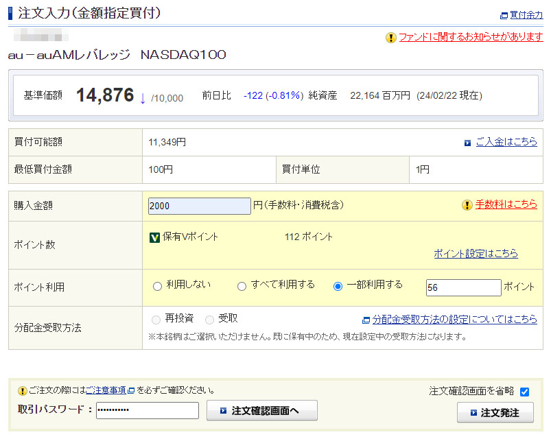 今回も相も変わらずにまずは「auAMレバレッジNASDAQ100」へ2件分なので2,000円分。