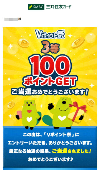 今回は「SBI証券 投信マイレージ」と「三井住友カードVISA(NL)Vポイント祭特典プレゼント(2月抽選)」の2つです。後者はエントリーした記憶があり抽選で当たったようですw 「+100p」は嬉しいですね!