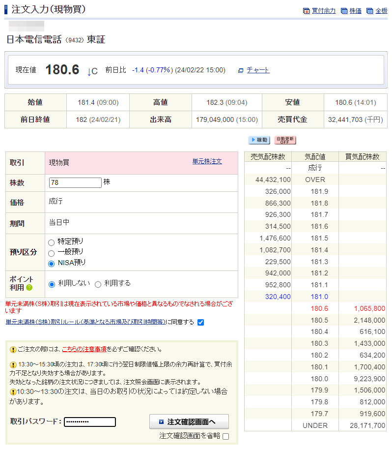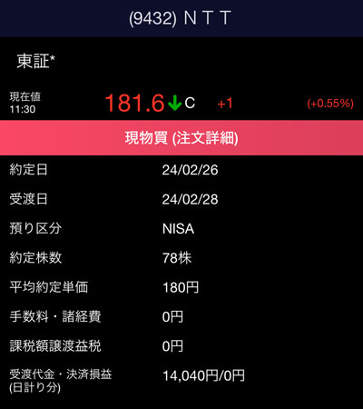 チャートを見ると何となくこれから上昇しそうな感じなので183になる前(あくまでも感でしかありませんが・・・)にとりあえずNISA口座が100株になるように78株で買い注文を入れました。