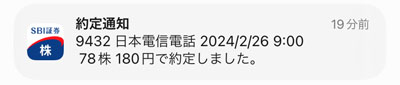180円でした!注文時よりやや下がっていて少し意外な感じ・・・PTSではやや上げていたのですが。まぁ嬉しい誤算です。これでNISA口座で100株、特定口座で300株の保有となりました。