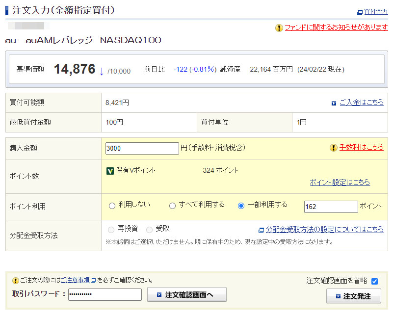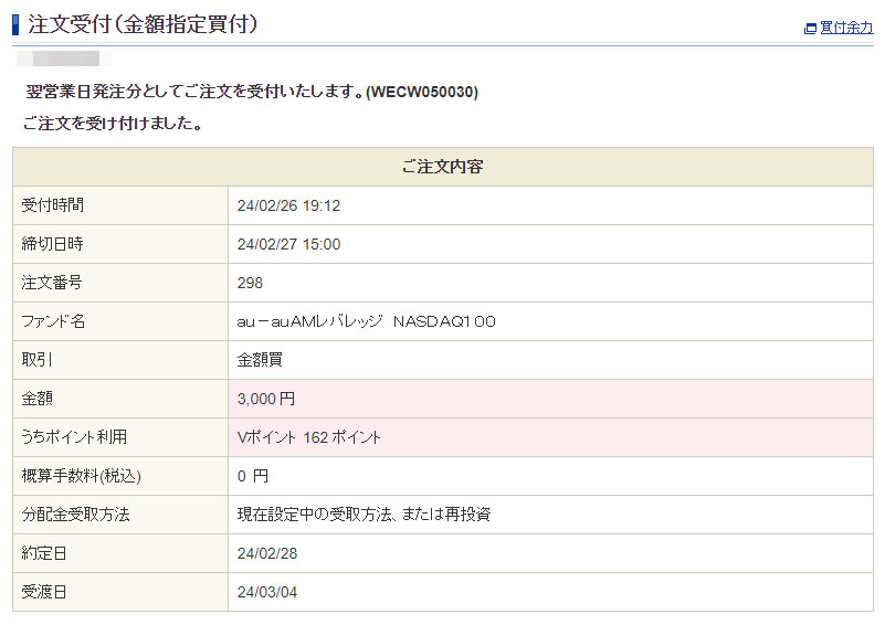 そんなこんなでまた何時ものように「auAMレバレッジNASDAQ100」へ今回は3件分で3,000円相当になります。