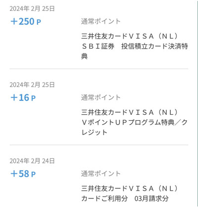 ・・・で、毎月入るポイントです。②は多分、Vポイント対象店舗でのタッチ決済でのものかと?
