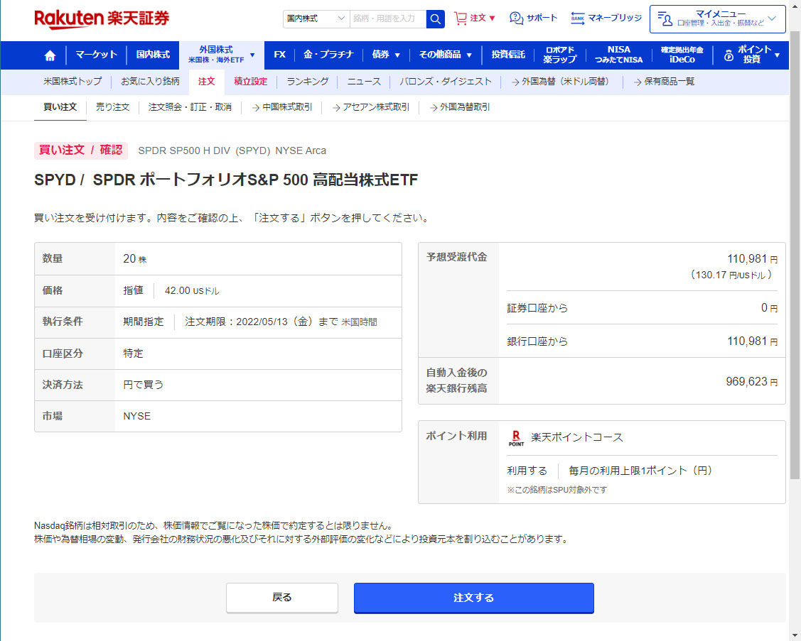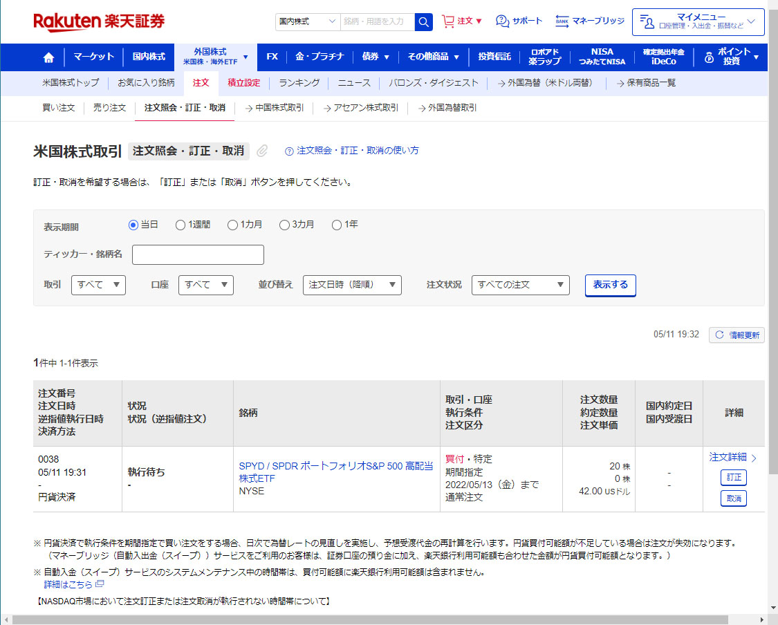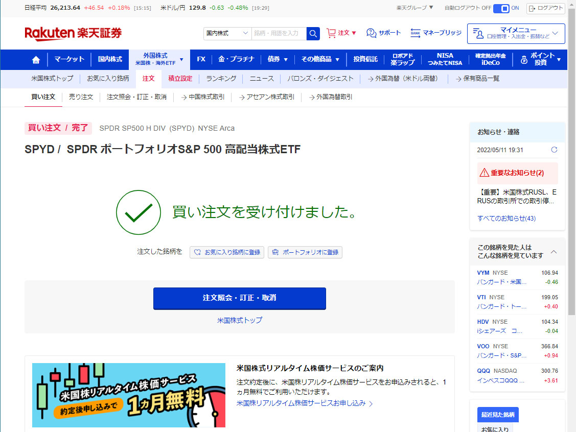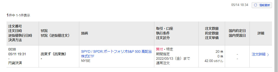 ヤフオクの売上金を楽天銀行へ移したのでこれを機に「SPYD」を買い増ししてみようと思いました。SPYDは年4回の配当で次の配当は6月です。権利落ちが多分5月末なので今のウチにと数日前から株価をウォッチしていました。