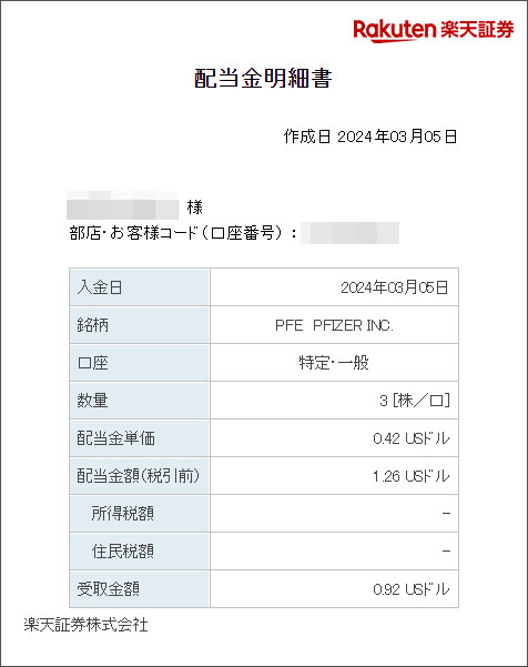 ファイザー(PFE)からの配当が入りました|2024.3 昨年の末に購入したファイザーからはじめての配当が入りました。 3株しか保有していないので微々たるものですが・・・嬉しいw $0.42×3株=$1.26 $1.26×0.9=$1.134 $1.134×0.79685=$0.9036 ん~~~税金のところがおかしいですな~??? まぁでも大体予定通りでした。