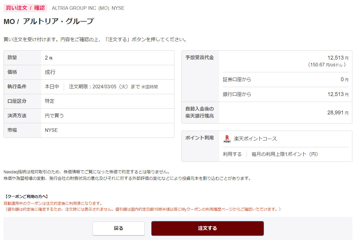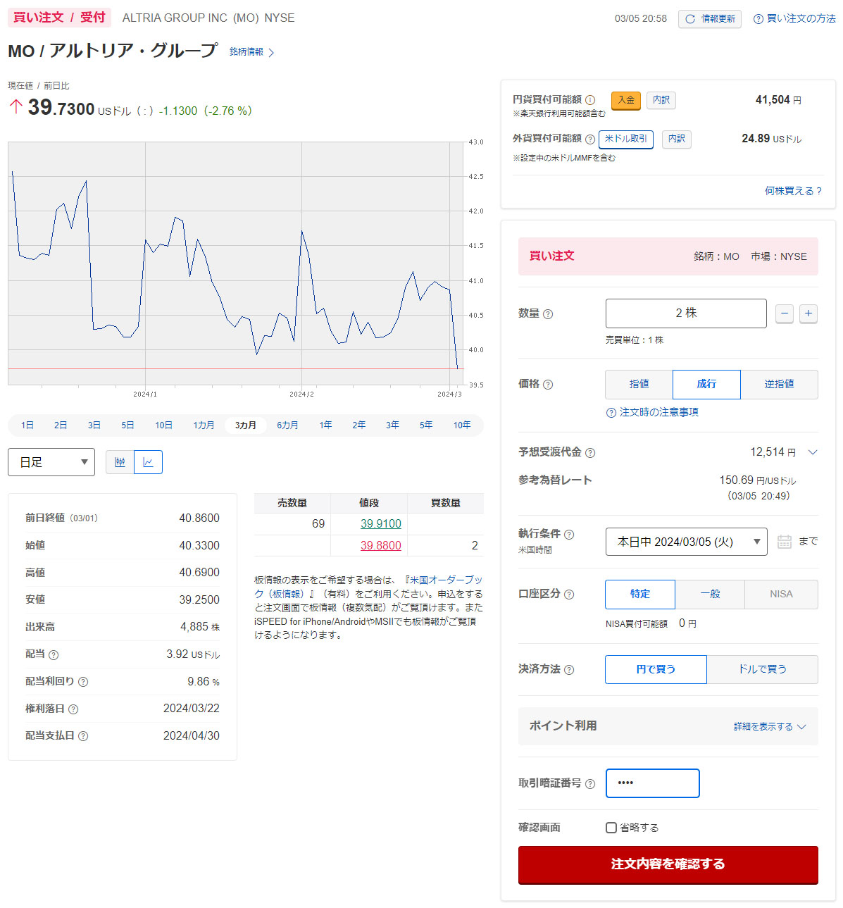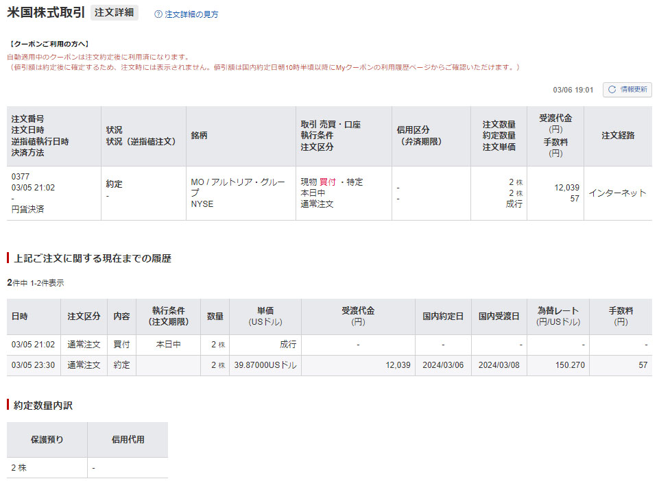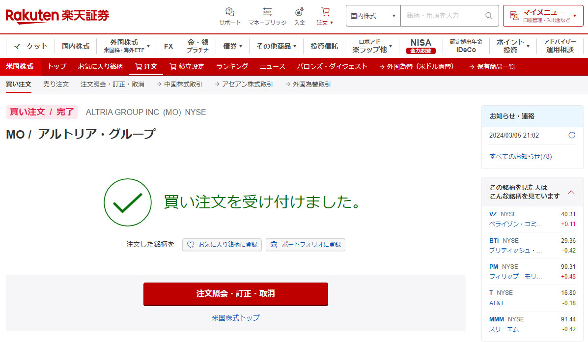 今日、ファイザーとフォードから配当が入り、再投資というわけではありませんが「アルトリア・グループ」を2株だけ買い注文を入れました。成行なので今夜遅く(日本)には約定します。
