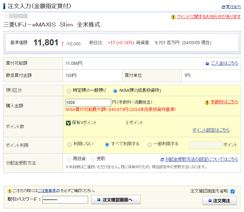 Vポイントが入ったのでeMAXIS Slim 全米株式を1,000円分追加|2024.3.6 毎度ですが残りの2ポイントを使ってやはり1,000円分を「eMAXIS Slim 全米株式」へ入れます。 こちらはNISAの成長投資枠です。すべて利用するで2ポイント。 約定は明後日の8日(金曜日)の深夜ですw