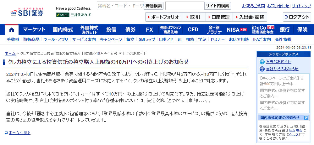 クレカ積立による投資信託の積立購入上限額の10万円への引き上げのお知らせ(SBI証券 WEBサイトより)