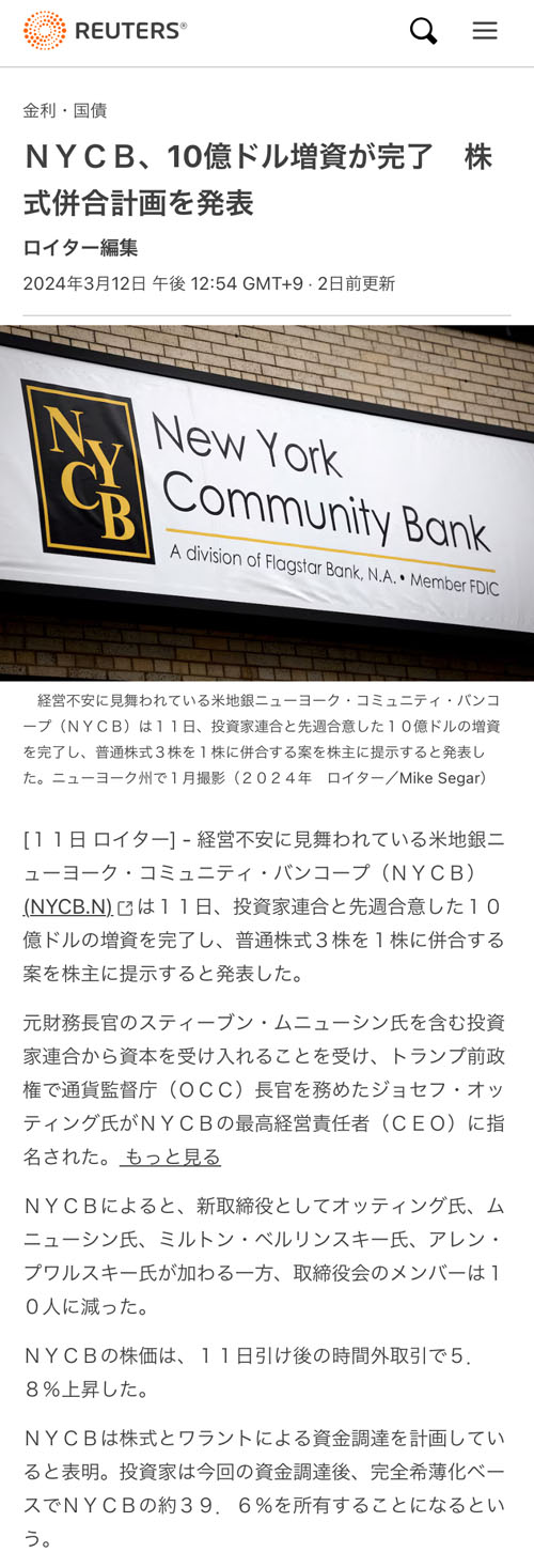 NYCB、10億ドル増資が完了 株式併合計画を発表(2024.3.12 REUTERSより)