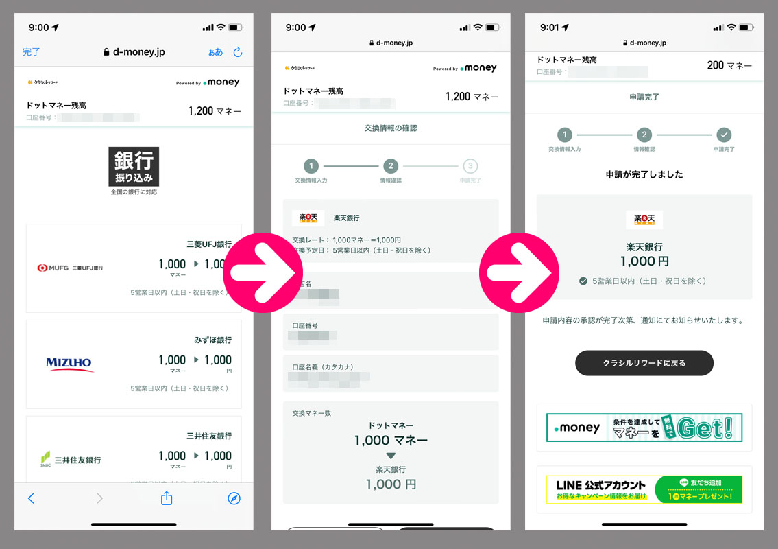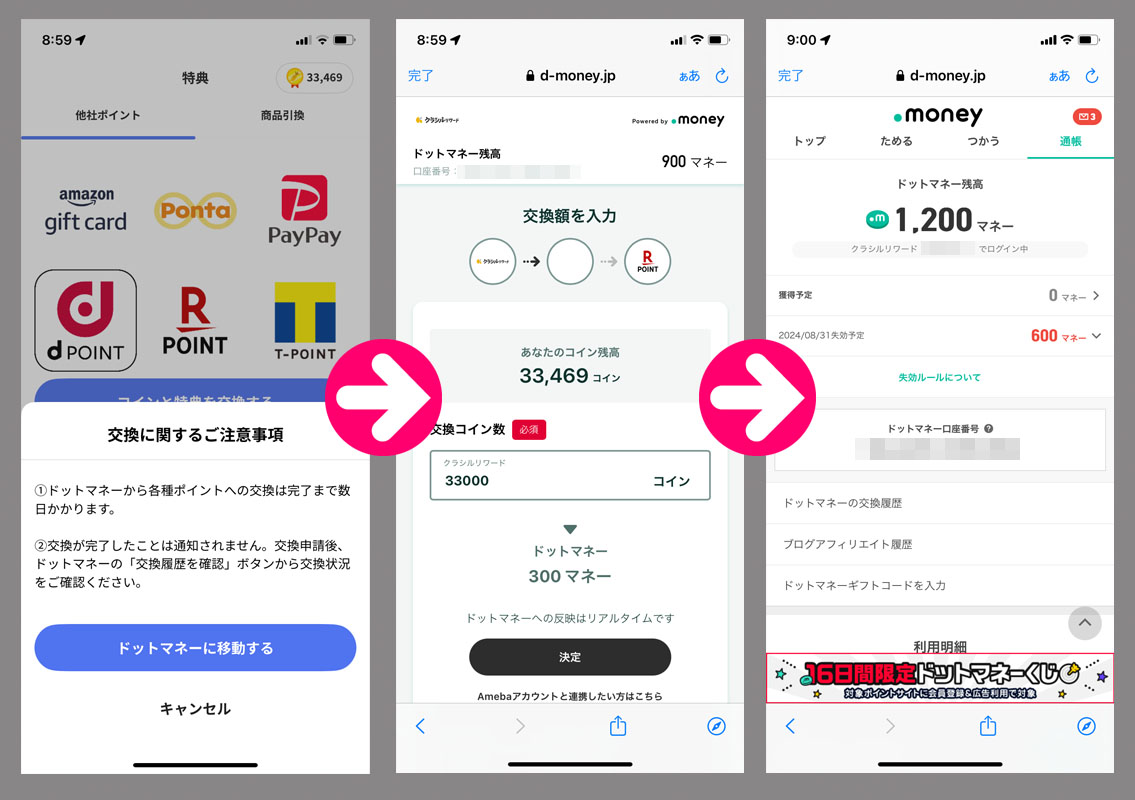 クラシルリワードのコインが33,000を超えたのでドットマネーに変換手続き、そしてこれでドットマネーも1,000ドットマネーを超えますので換金手続きへ・・・。