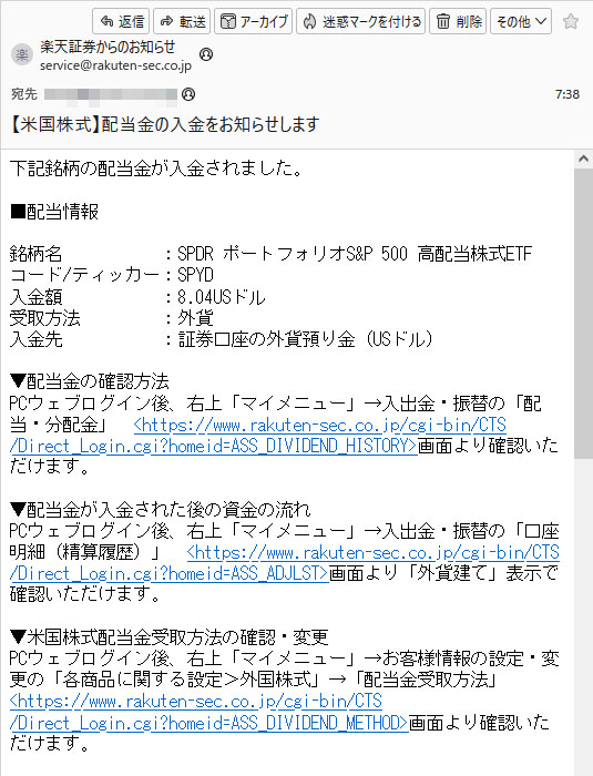 年4回の米国高配当ETF「SPYD」の配当(分配金)が入りました。