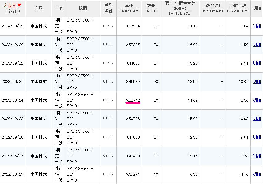 個人的に高配当とは言うもののもうあまりSPYDには期待していないので実際貰っても「へ~こんなモンか・・・。」って感じになっています。
