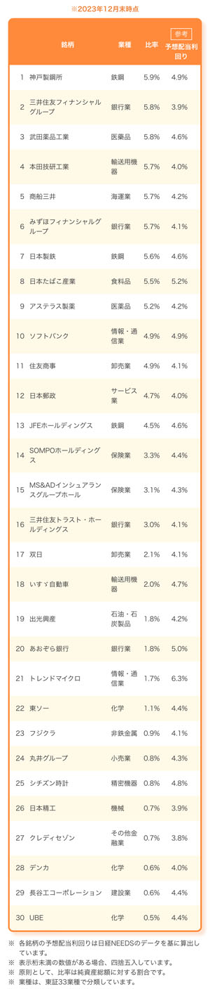 組み入れ銘柄(2023年12月時点)は下記の30銘柄