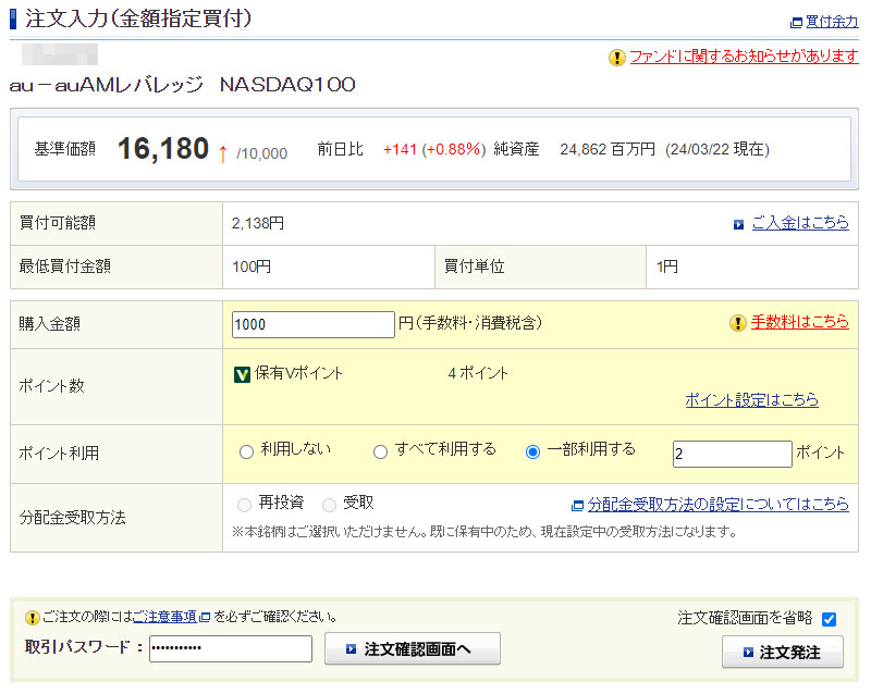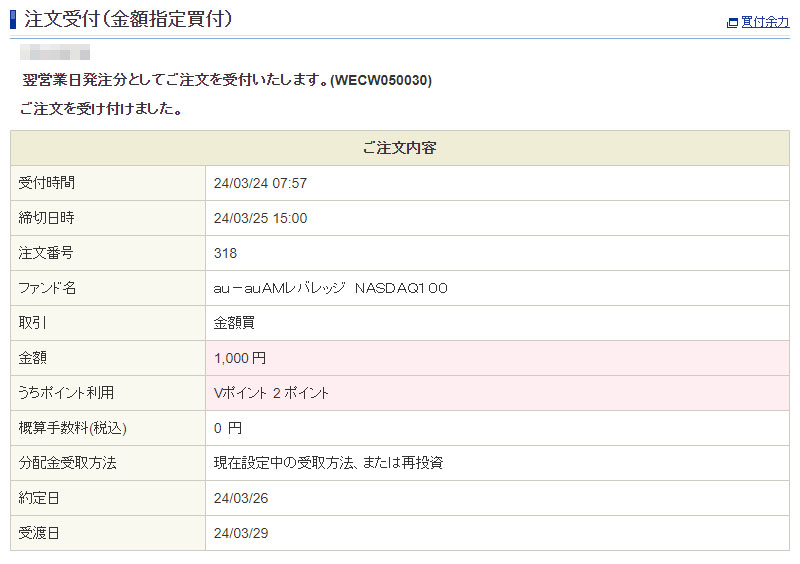 今回も半分の2ポイントを使い1,000円分。口座からは998円の持ち出しです。