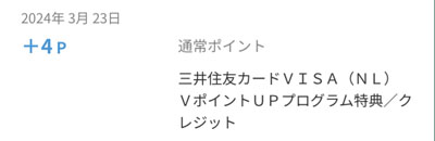 今回も「三井住友カードVISA(NL)VポイントUPプログラム特典/クレジット」分の4ポイントが入りましたので投資に回そうと思います。