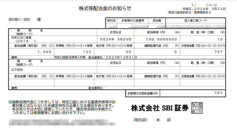 日本たばこ産業(2914)の配当が入りました|2024.3.25 JTから配当が入りました!今回で2回目です。 配当金は100円で10株保有ですので1,000円となり 税金を引かれ手残りは797円でした。 新NISAの成長投資枠にも2株ありますが今回は間に合わなかったようです。 JTは3月、9月の配当なので少し早めに来て嬉しい!頑張って100株にしなければwww