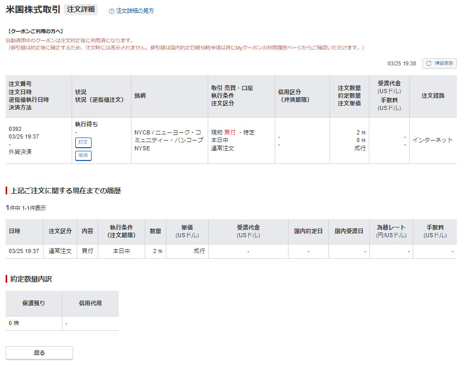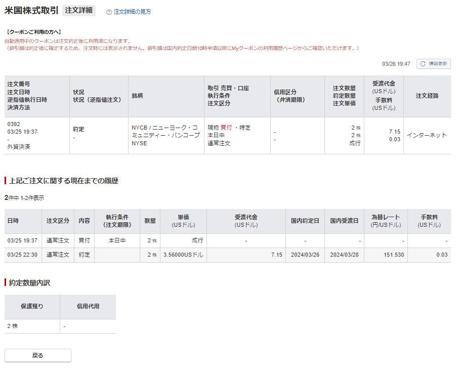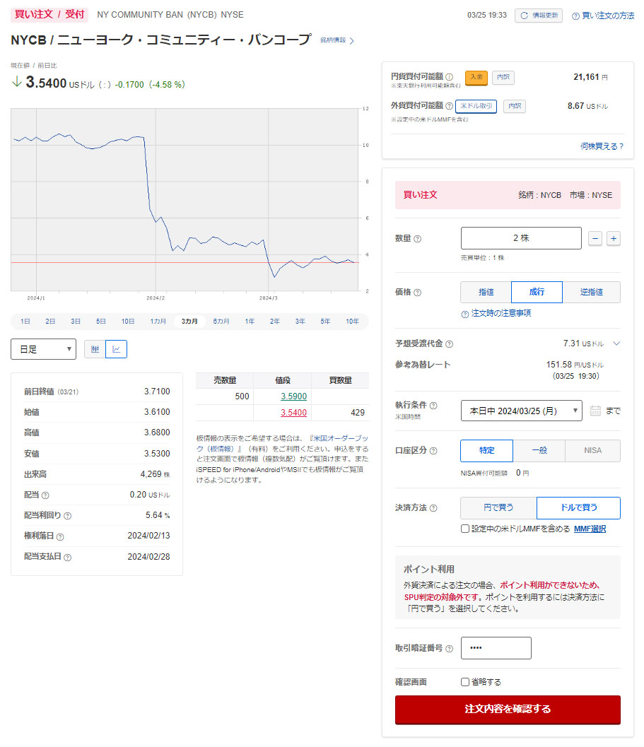指値で$3.40あたりも考えましたが2株だしw 成行の外貨決済で!