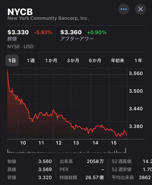 NYCBは配当0になったのかと思ったら$0.01らしいです。まぁ0が妥当なところだと思っていましたが僅かでも出そうとする姿勢は好感が持てます。多分、株主の事は考えていそう。もし経営が改善すれば間違いなく増配するでしょう!頑張って欲しい。くれぐれも破綻は回避してくださいましw