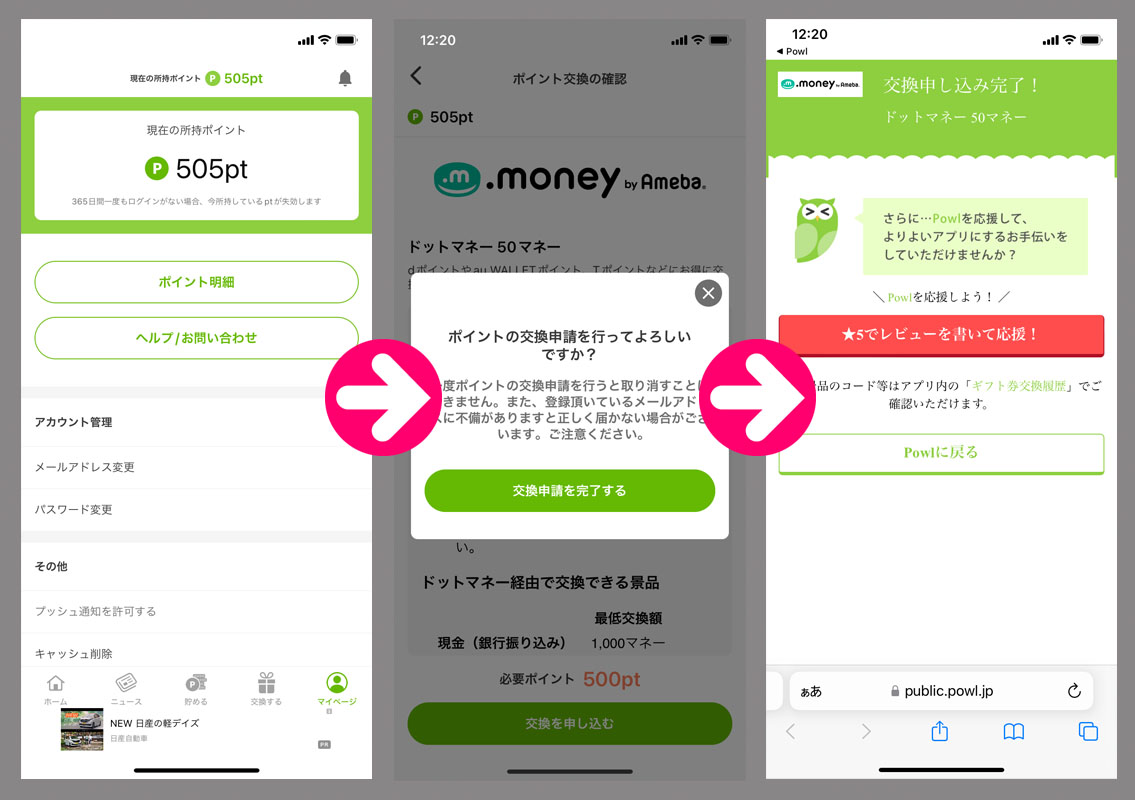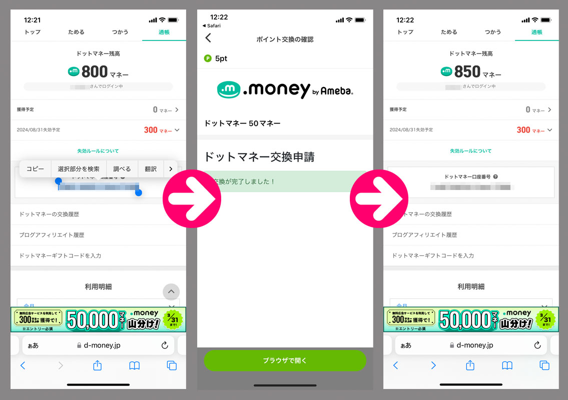 Powlのポイントが貯まったのでドットマネーに変換|2024.3.27 Powlのコインが500になったのでドットマネーに変換します。 前回書きましたが半端な300ドットマネーをきれいに使い切るために50マネー(500ポイント)を4回刻んでトータルで1,000になるように・・・。 半端300に先日の500で現在800。あと200です。 まずはPowlで500ポイント→50ドットマネーへの交換申し込み。 ドットマネーの口座番号をコピペして手続き完了です! これで850マネーなのであと150マネー(Powlの500ポイントを3回)です。 500ポイントぐらいなら訳なく貯まりますね~ 今回は4日間でした。