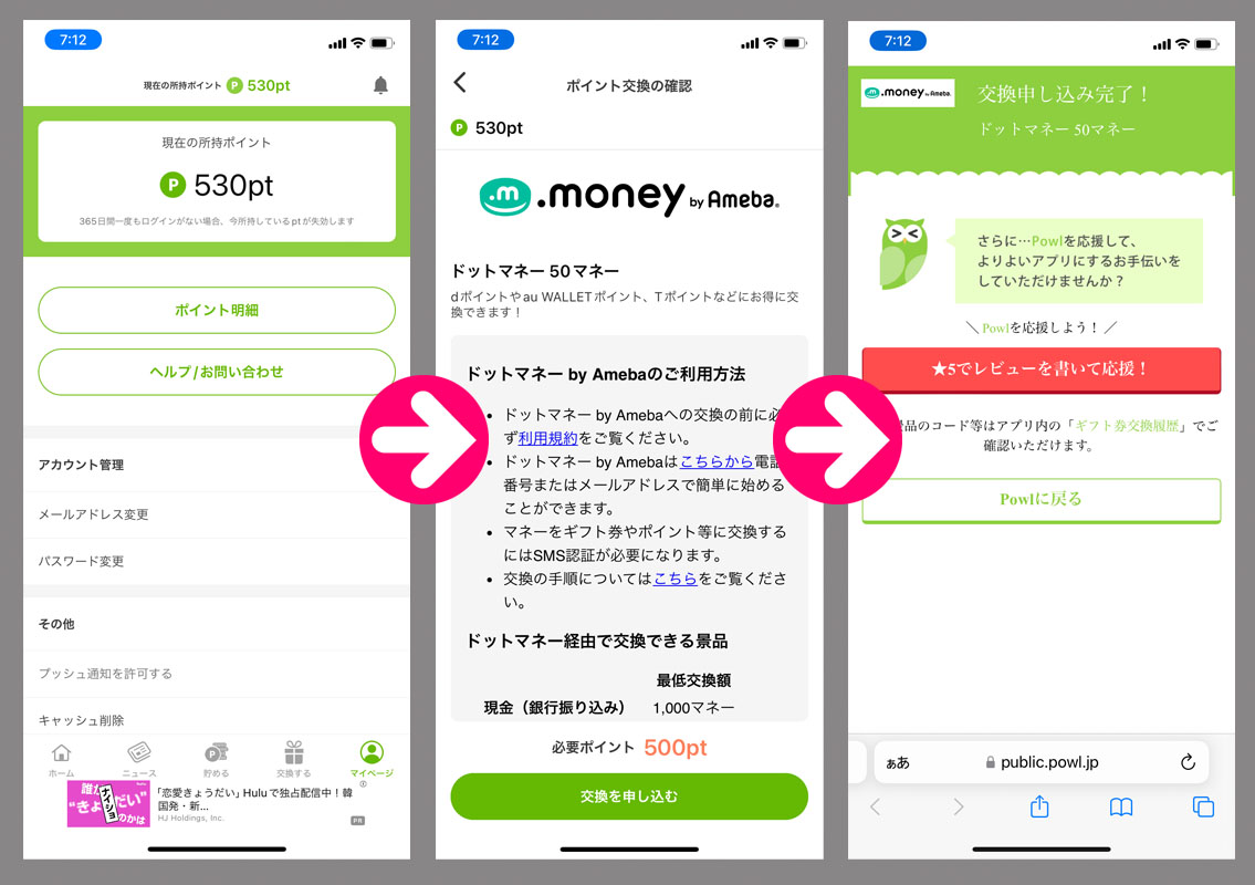 530ptの500pt分を50ドットマネーに交換します。(↑)Powlアプリ内でまずは申し込み!