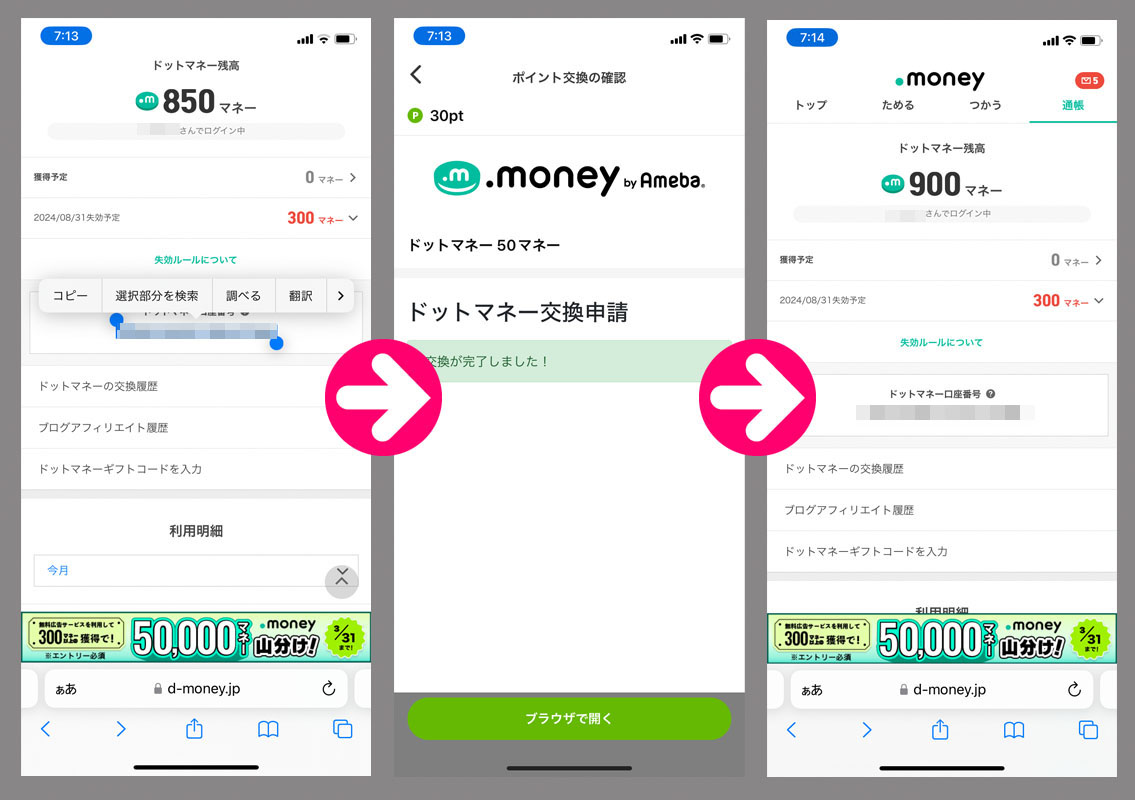 ドットマネーにログインして口座番号をコピー&Powlに戻ってペースト!