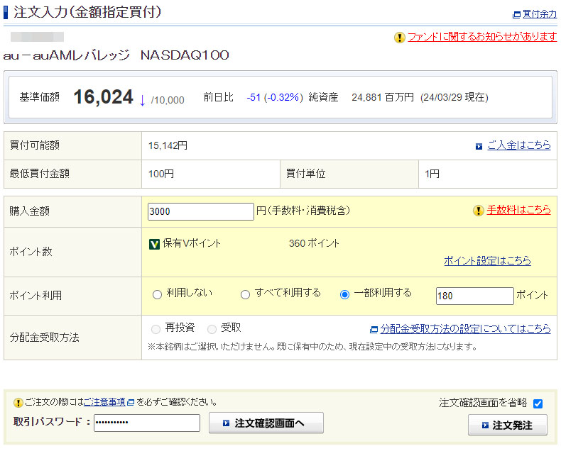 Vポイントが入ったのでauAMレバレッジNASDAQ100を3,000円分追加|2024.3.30