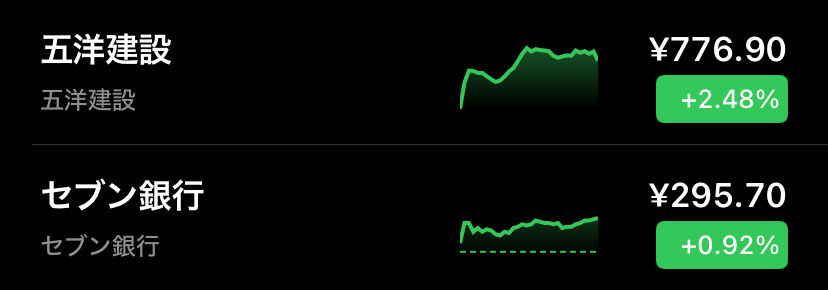 ですので「五洋建設」と「セブン銀行」を合わせるとだいたい1,000円になるので月々2株づつ買えます。これなら単元まで約4年。。。それまで使えてるかな?スマホwww
