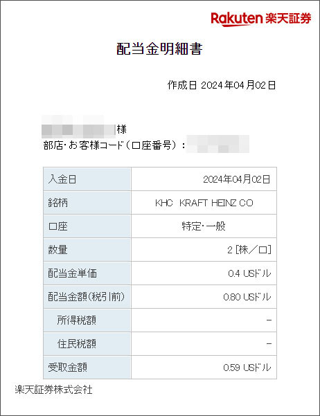 クラフト・ハインツ(KHC)から配当がありました|2024.4.2 クラフト・ハインツから初めての配当が入りました! とは言え・・・僅か2株の保有なので少額です。。。 大体、予定通りで$0.59でした。 こちらも買い増したい気持ちはありつつも・・・資金が枯渇しています。。。 まぁ~ゴールがあるわけではないのでノンビリと・・・笑 同じく、今日配当があったBACと一緒に楽天証券からメールが来ていました。