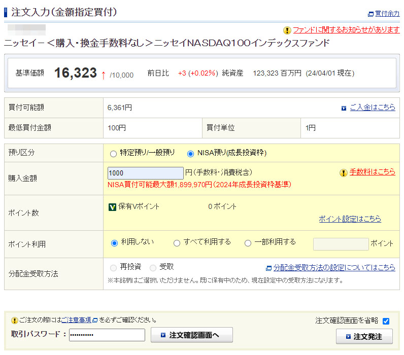 歩いて稼いだ資金を「ニッセイNASDAQ100インデックスファンド」へ|2024.4.2 先日換金の手続きをしていた「クラシルリワード」分が現金化され入金があったので「ニッセイNASDAQ100インデックスファンド」へ投資します! CYBERAGENTから楽天銀行口座に入金で何時ものように1,000円です。 何時もと同様にNISA(成長投資枠)口座でそっくりそのまま1,000円入金。 今日は火曜日(夜)なので4日(木曜日)の約定です。 週末には間に合いましたね!