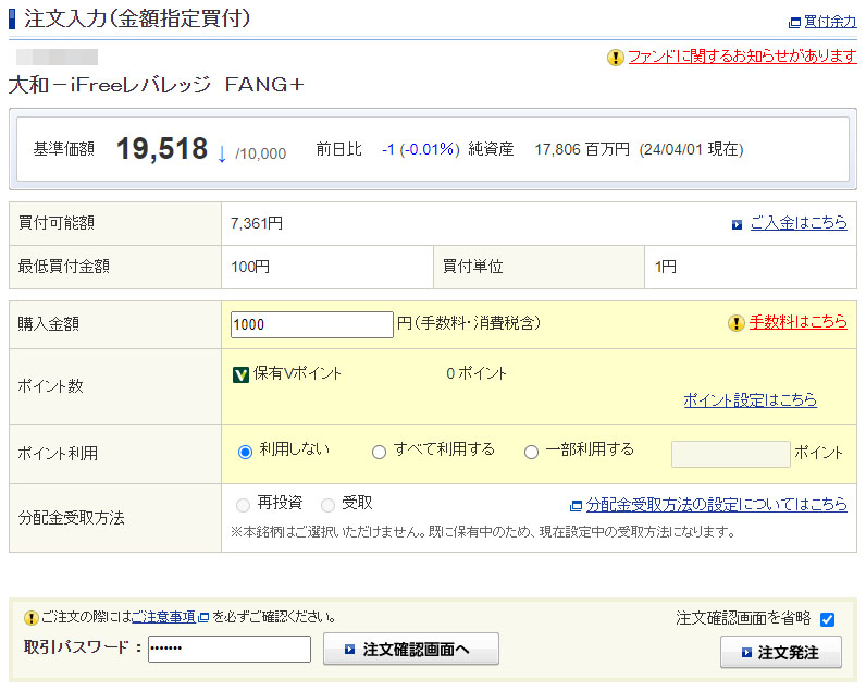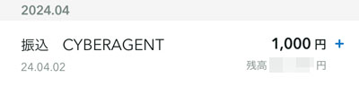 歩いて稼いだ資金を「iFreeレバレッジFANG+」へ|2024.4.2 そして「トリマ」分の換金手続きも完了し、こちらは三井住友銀行口座に・・・ CYBERAGENTから1,000円の入金。 やはり、こちらもそのまんま全額1,000円を入れます。 レバなので特定口座になります。 明日の扱いなので約定は4日(木曜日)になります。 最近はあまり株価を追いかけていなく状況がイマイチわかりません。。。 まぁ少しでも多くの口数が買えればいいけど・・・どうせ高値に張り付いてるんでしょうねwww
