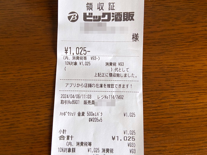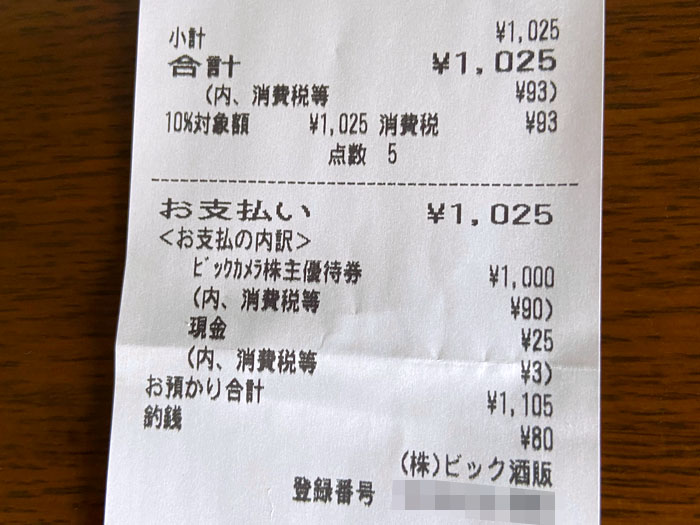 5本買って税込み1,025円でしたので端数の25円は現金で支払い。普段持ち歩いていないので「ビックVIEWカード」を忘れました。
