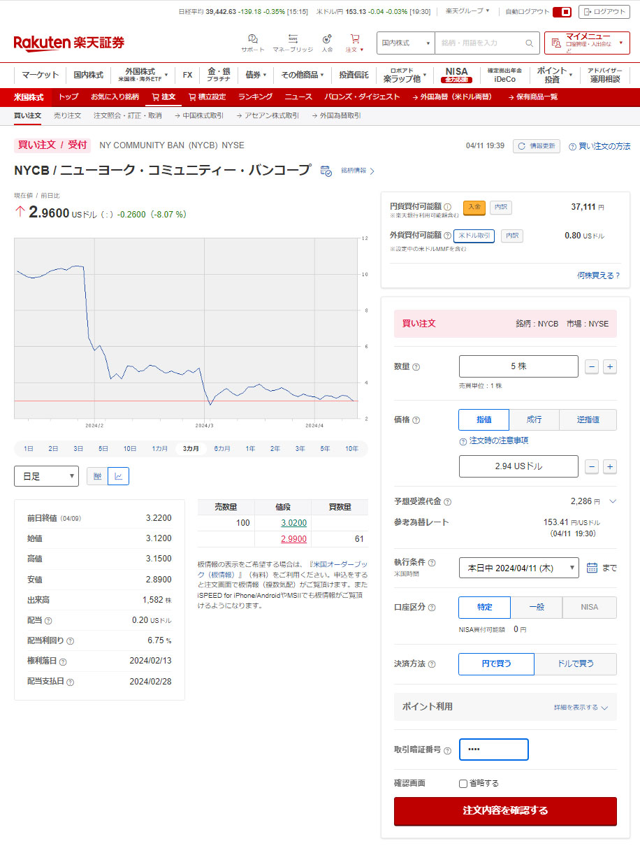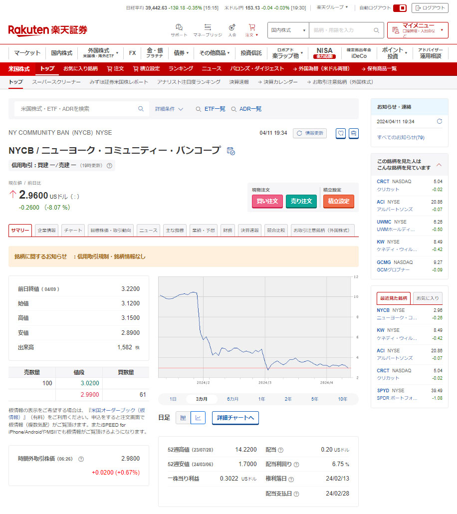ニューヨーク・コミュニティー・バンコープ(NYCB)がサポートだと思っていた$3を遂に割りました。少し悩み5株追加することに・・・もちろん指値ですが。