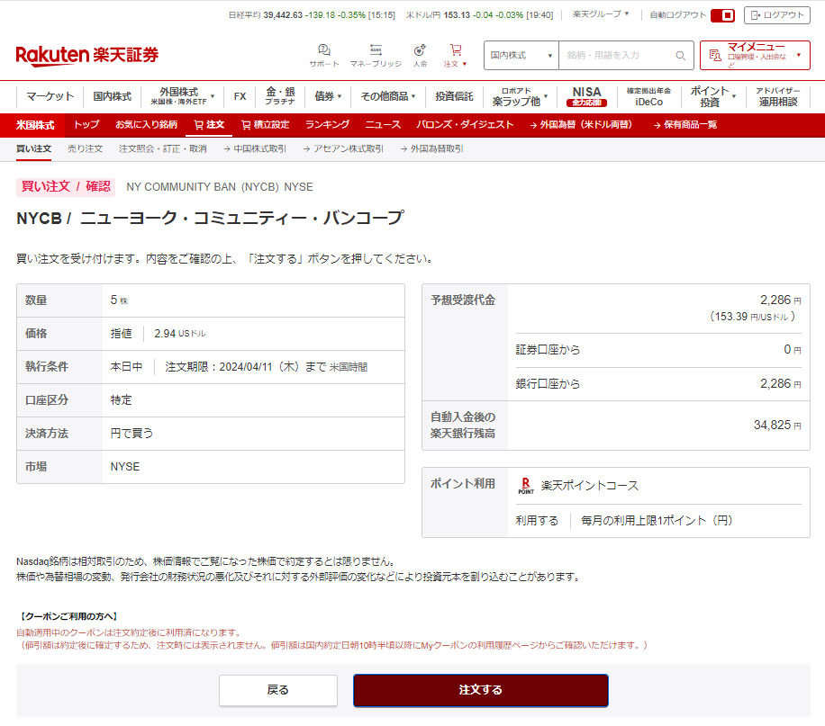 これでNYCBは40株保有となり平均取得単価は$3.5115$。まだまだマイナス幅が大きい。。。