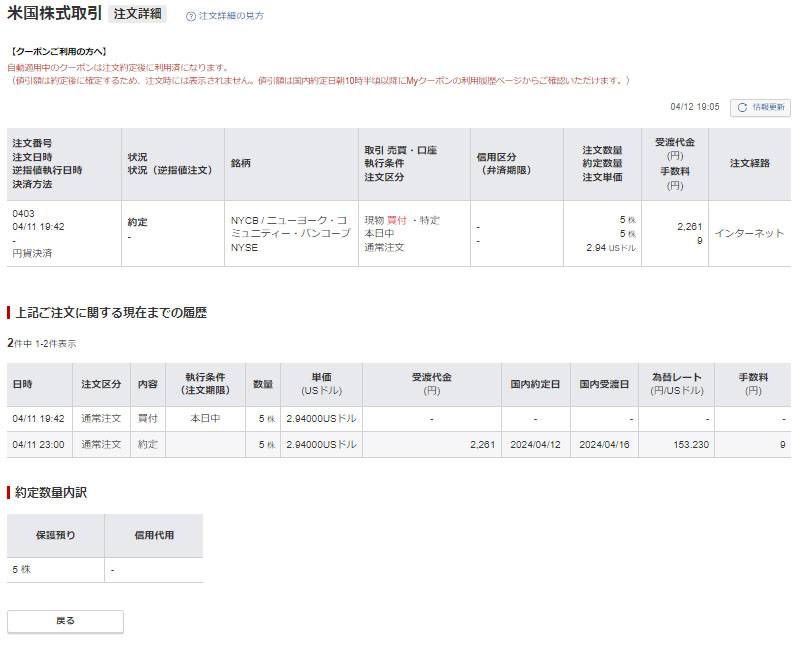 4月12日(日本時間)確認するとやはり約定していまた。