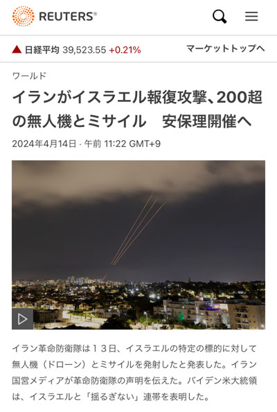 今のところイランからはこの攻撃で手終いのようなコメントが出ていますが、イスラエルがどう出るか?ですね。米国の影響力を図る上でもこれは注目です。