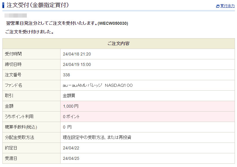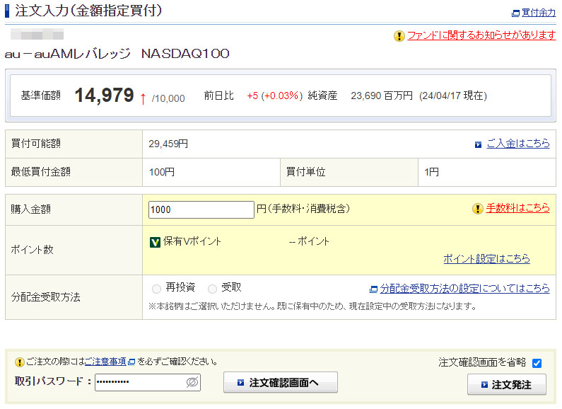 Vポイントが入ったのでauAMレバレッジNASDAQ100を1,000円分追加|2024.4.18