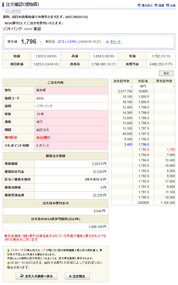 そして昨日13株買ったばかりですが「ソフトバンク」も下げ止まらないので今日は10株買いました。こちらは単元未満なので成行で約定します。