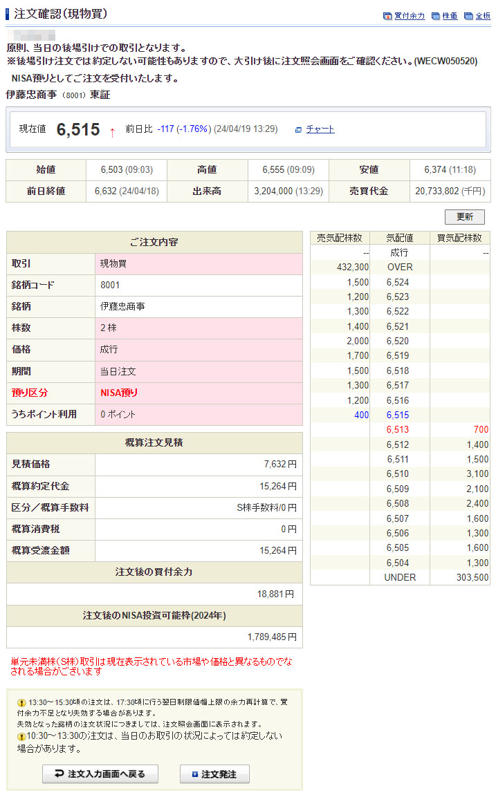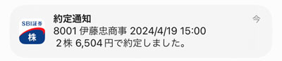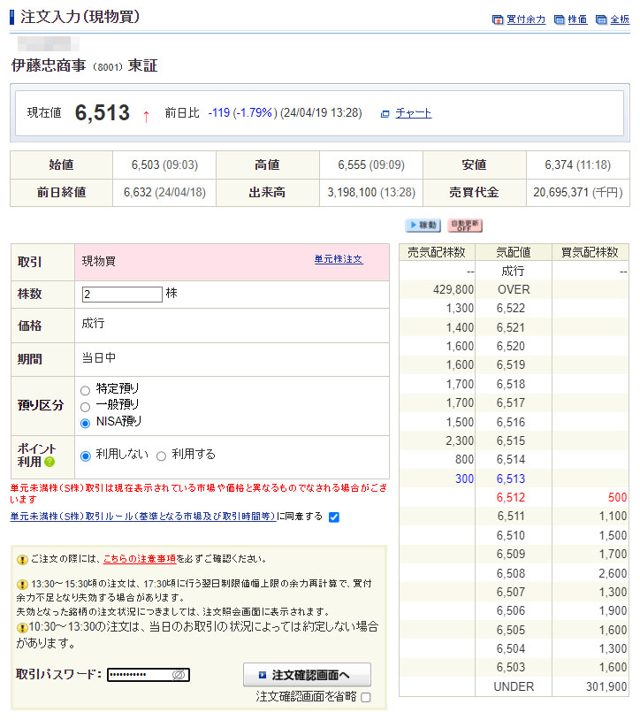伊藤忠商事はお昼前で-2%近くで推移していました。買い注文を入れた時は6,513円。高くなりましたね~