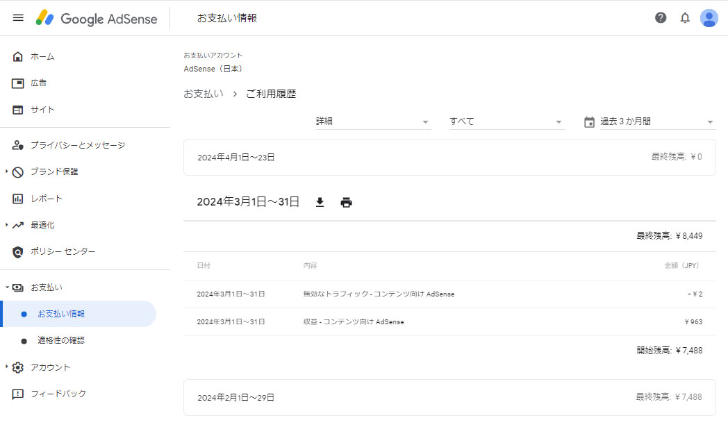 WEBサイトをご覧いただければお分かりかと思いますが私はGoogle Adsenseをしていて雀の涙ですが広告収入があります。その収入も9割以上は別のサイトからの売上です。。。今回、支払い下限金額の8,000円を超えたので入金がありました。