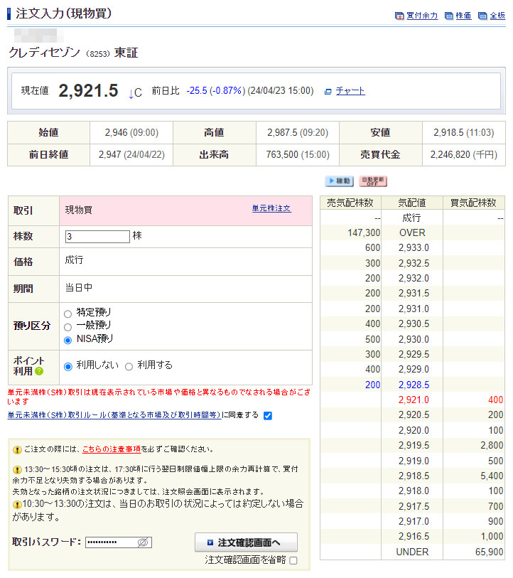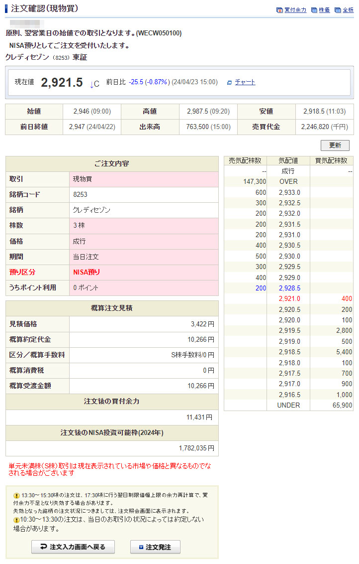 こちらの資金も投資に回せるので「クレディセゾン」を3株買う事にしました。