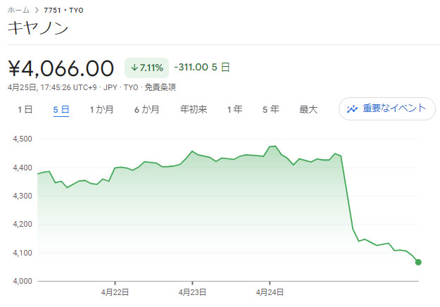 キヤノンが大きく下げているとあり7%下げていると・・・