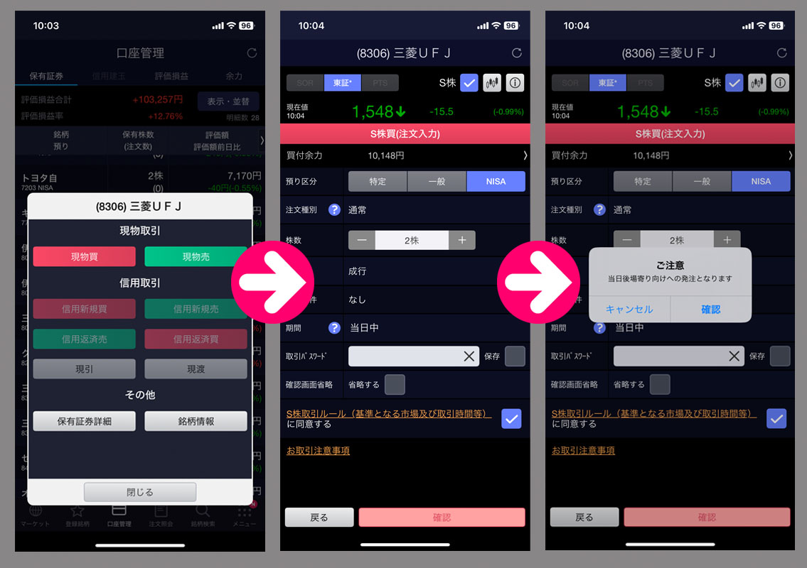 NISA成長投資枠で単元未満2株の買い注文。「当日午後寄り向けへの発注となります」とポップアップがでます。