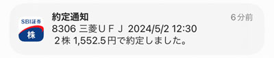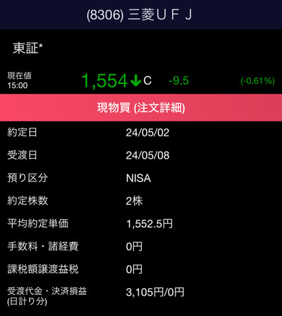 ですがNISAでまた購入していない「三菱UFJフィナンシャルグループ」がやや大きめに下げていたので2株だけ買う事にしました。大きめといっても約1%ですw