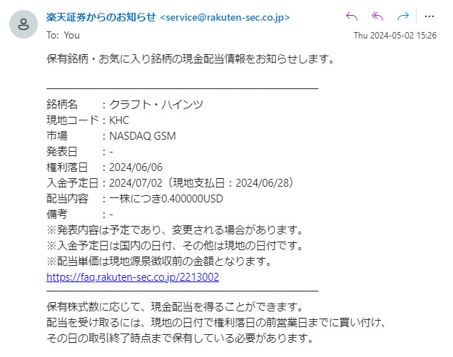 クラフト・ハインツ(KHC)の配当予告メールが楽天証券から来ました。