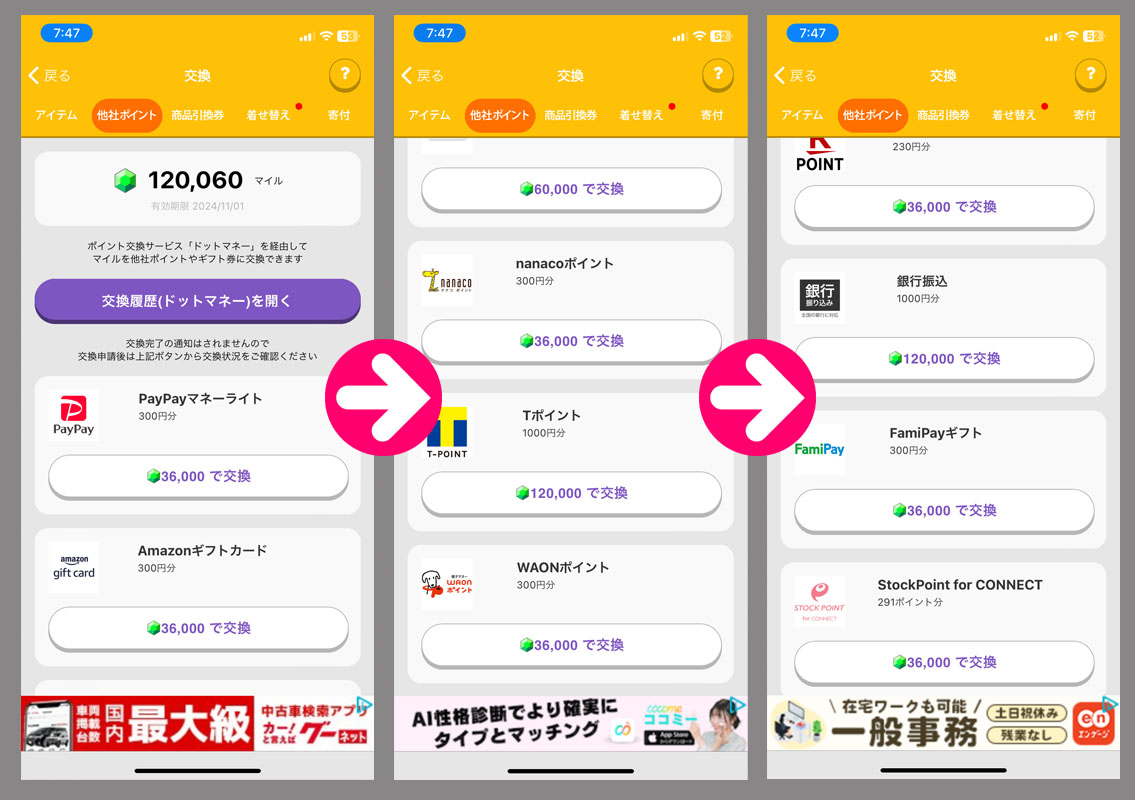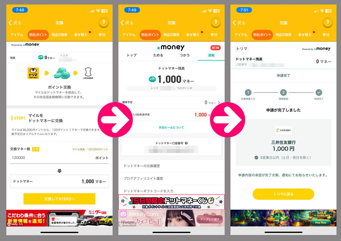 トリマのマイルが120,000に達したのでドットマネーに変換。からの換金手続きをしました。
